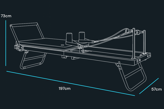 Reformer Dimensions: 33kg, delivered in 2 boxes. 197cm x 73cm x 57cm